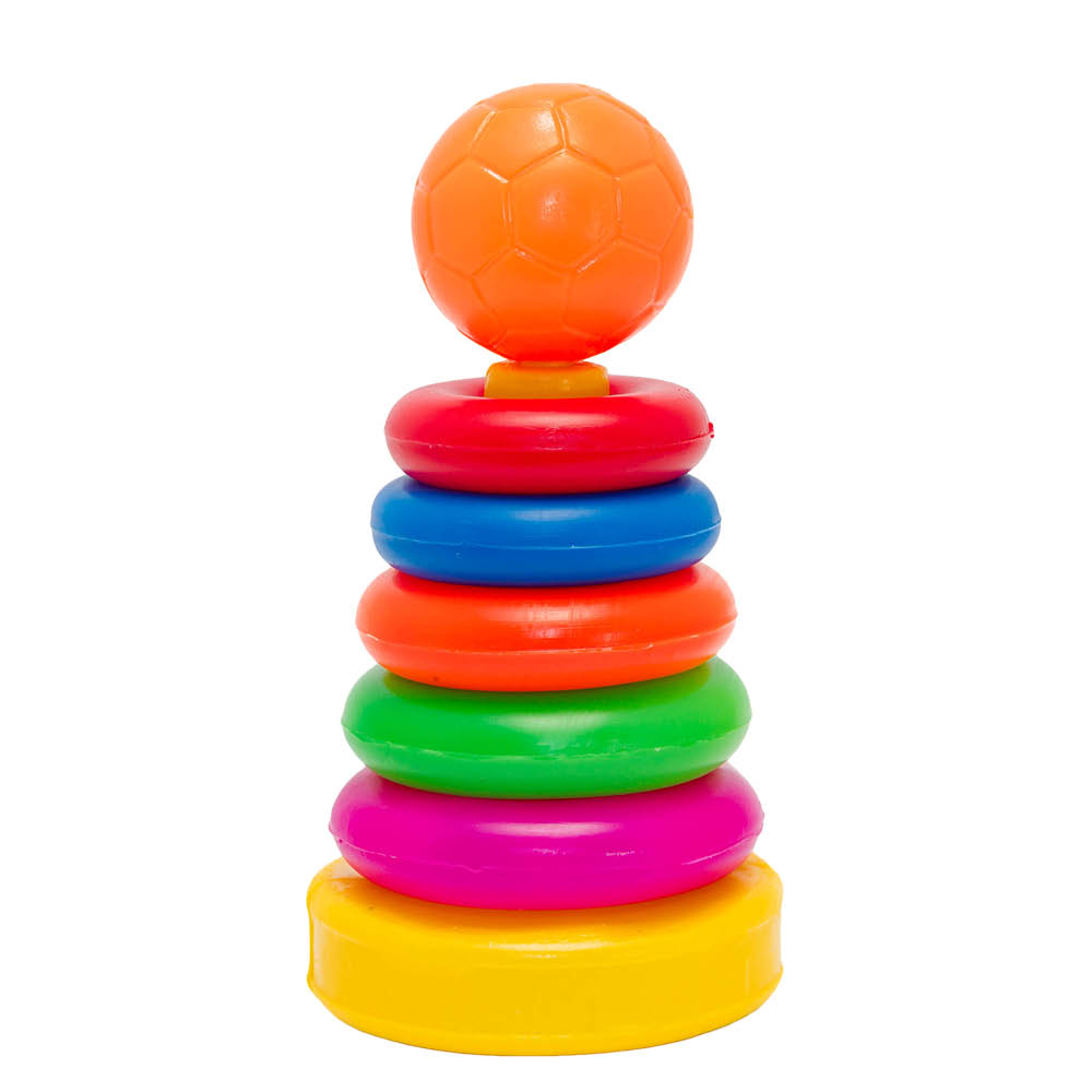 Cono con aros de plástico con pelota. Sirve para insertar los aros en el cono e identificar y aprender los colores.